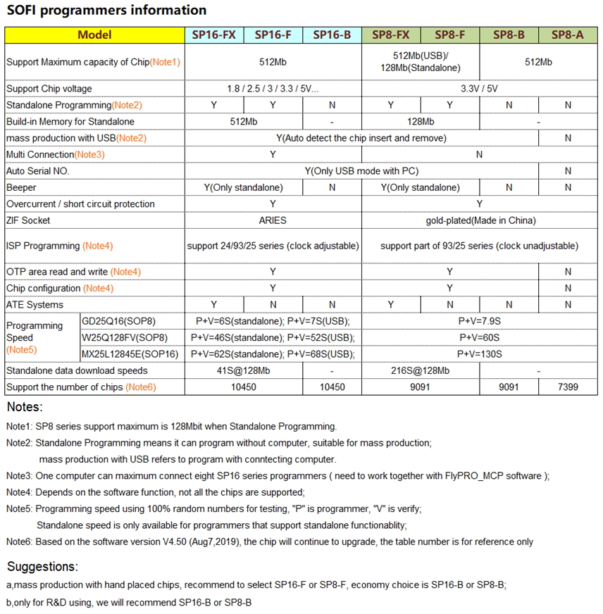 SFLY programmer selection table