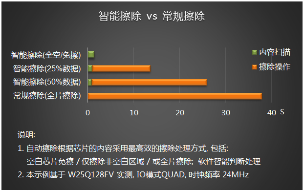 FLASH智能擦除技術(shù) 根據(jù)芯片內(nèi)的數(shù)據(jù)自動匹配最佳的擦除算法: 芯片全空:自動跳過擦除操作; 芯片部分區(qū)域有數(shù)據(jù):僅擦除有數(shù)據(jù)的區(qū)域; 常規(guī)編程器只能使用全片擦除,大大降低了量產(chǎn)燒錄的效率。