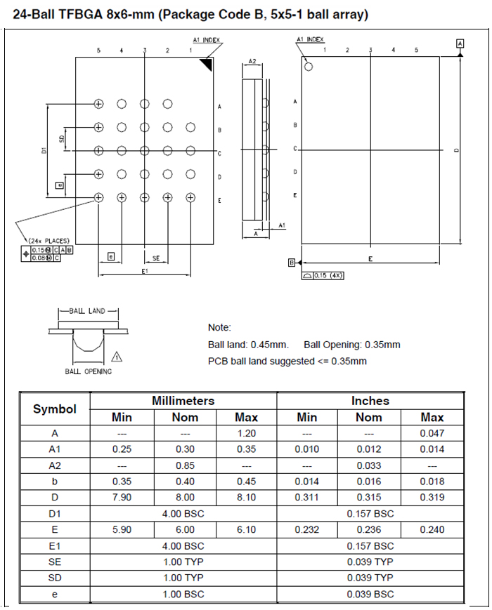 封裝類型:BGA24,尺寸:8x6mm,管腳:5x5 陣列