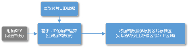 1. 在芯片中保存基于UID的加密數據, 這部分可以在存儲芯片燒錄時通過燒錄器完成. 流程如下: