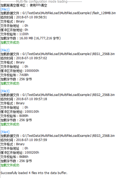 某些時(shí)候我們需要將多個(gè)文件合并之后, 一起燒錄到芯片內(nèi)。這個(gè)時(shí)候,需要分多次逐一加載每個(gè)數(shù)據(jù)文件(參考軟件幫助: 加載多個(gè)文件到緩沖區(qū)), 加載時(shí)需要根據(jù)每個(gè)文件對(duì)應(yīng)的芯片存儲(chǔ)位置設(shè)置緩沖區(qū)開(kāi)始地址(緩沖區(qū)偏移量)。在開(kāi)發(fā)測(cè)試階段反復(fù)執(zhí)行這些動(dòng)作會(huì)比較繁瑣,且容易出錯(cuò)。基于此,SP32系列的軟件在V1.13版本時(shí),增加多個(gè)文件一次性合并加載的解決方案。