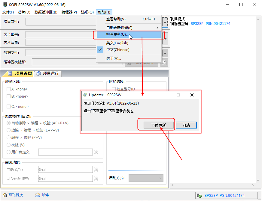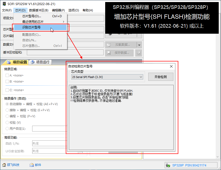 2022-06-21,碩飛科技發布SP32系列編程器(SP325/SP328/SP328P)軟件V1.61版,除了繼續增加芯片型號的常規升級外,此版還增加了芯片型號(SPI FLASH)自動識別功能。