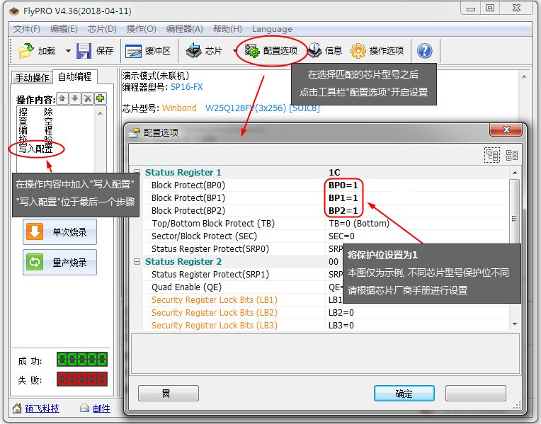 在操作內容中最后一步加入"寫入配置", 同時設置芯片的配置選項, 設置芯片的保護位. 如下圖: